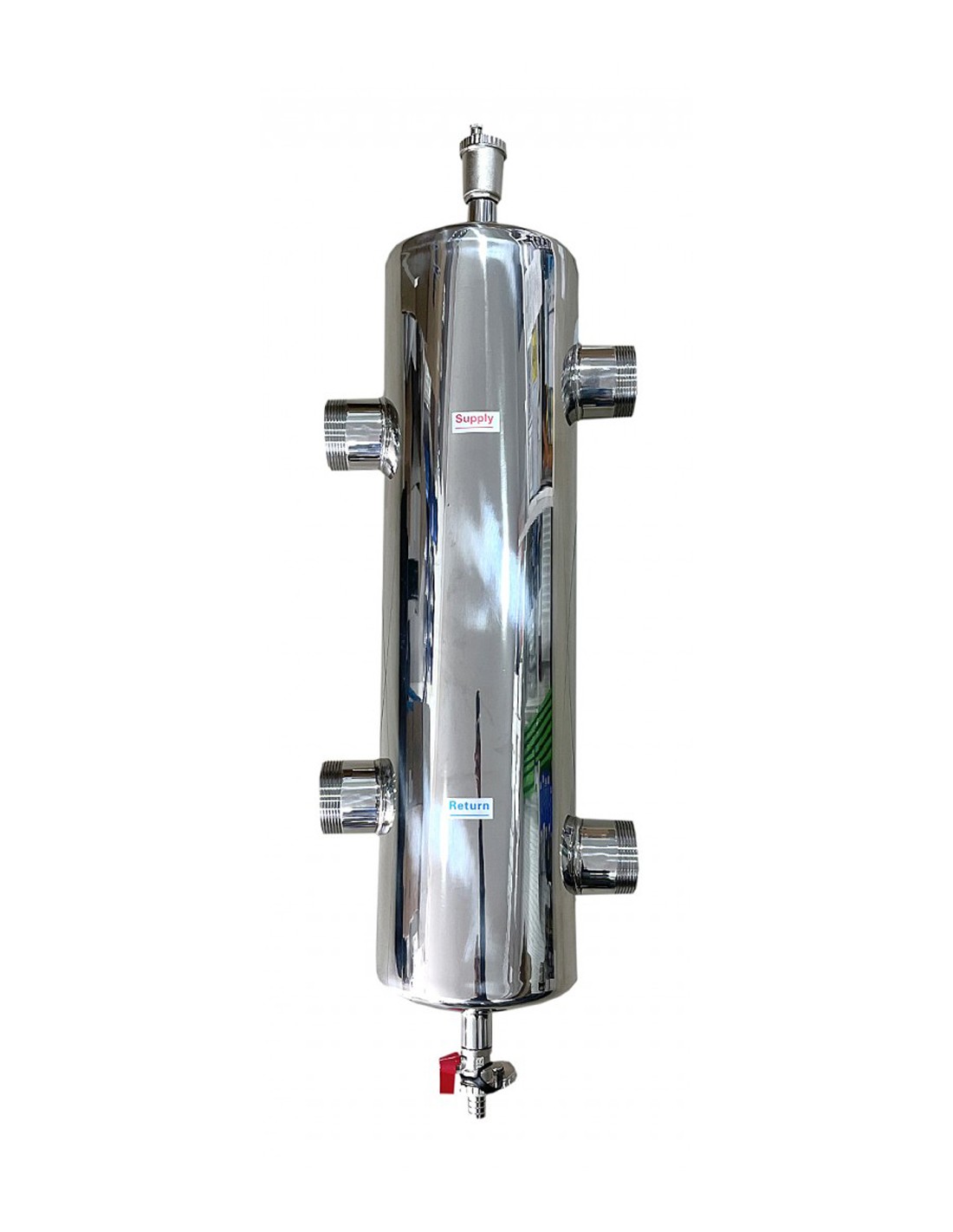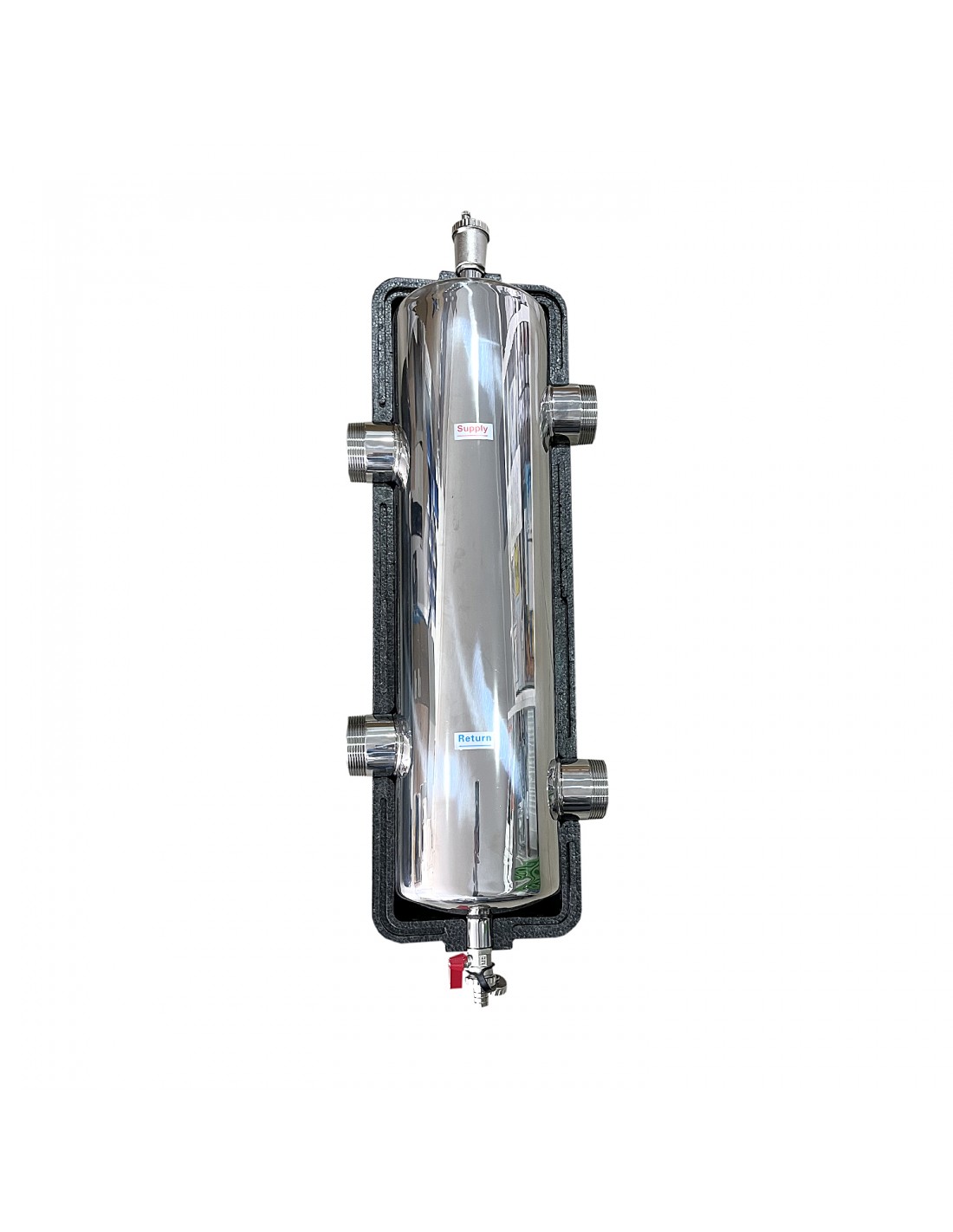 Separator hidraulic / egalizator de presiune și supapă de aerisire automată pentru separarea hidraulica dintre circuitul primar si cel secundar, care face circulatia individuala total independent.