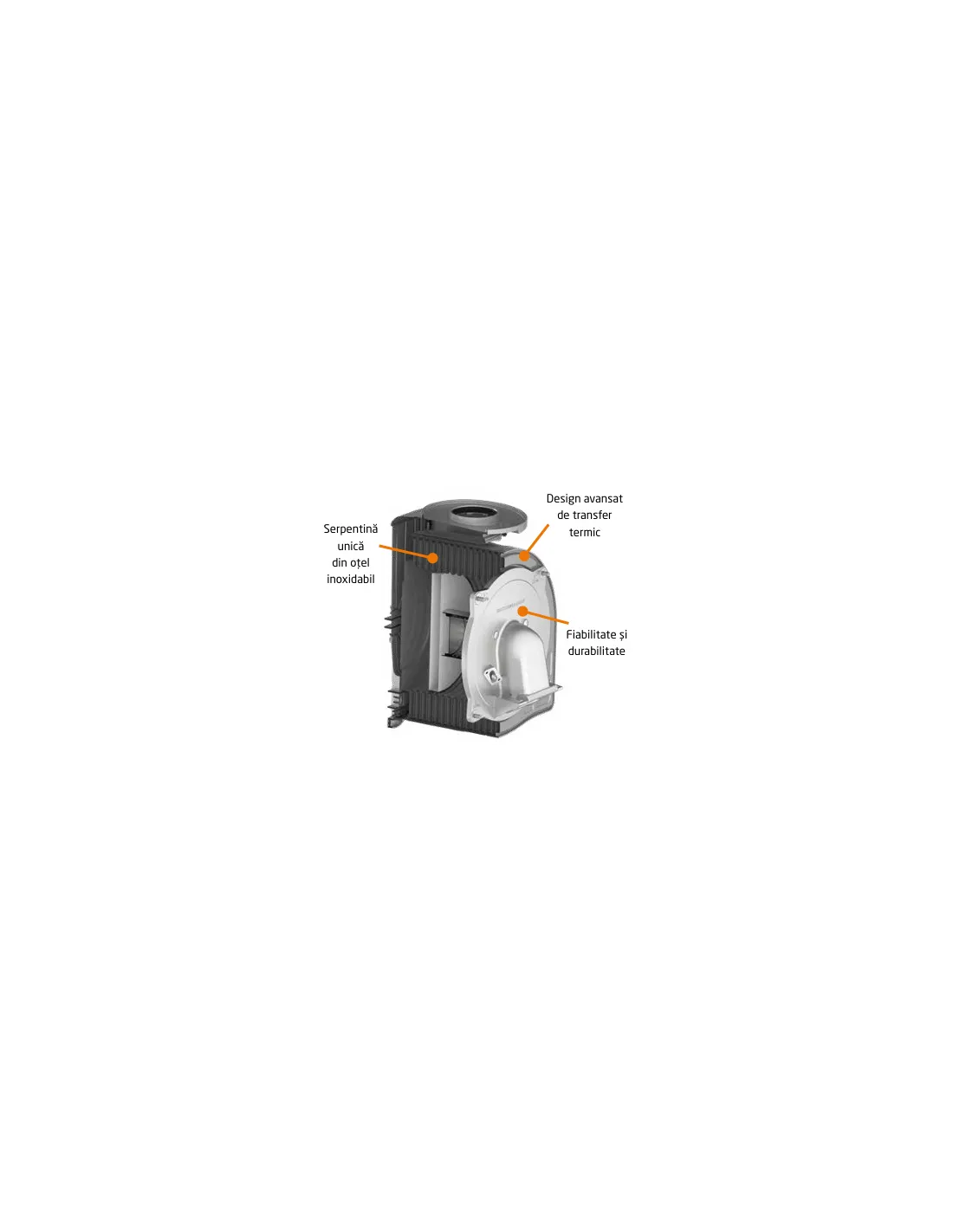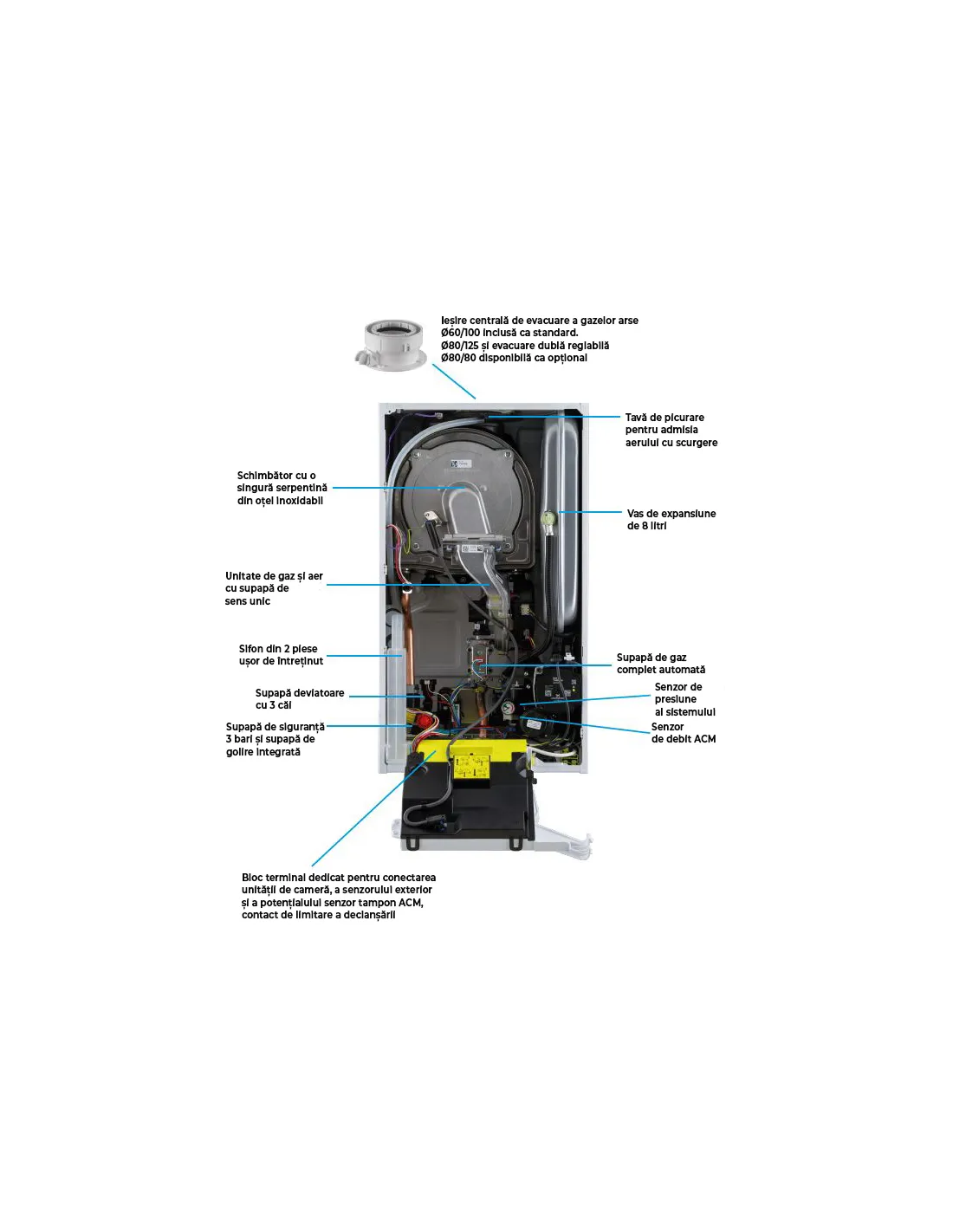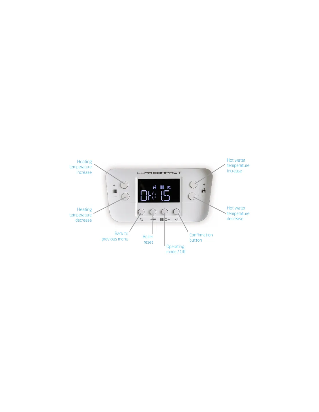 - Beneficiaza de pompa de circulatie cu modulare totala, vana cu trei cai, supapa de siguranta, vas de expansiune pe circuitul de incalzire si panou de comanda digital cu ecran LCD retroiluminat, precum si de functia anti-inghet